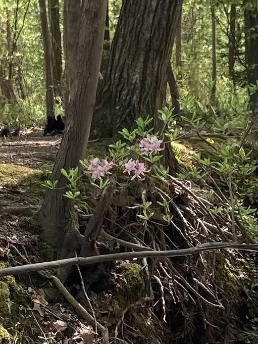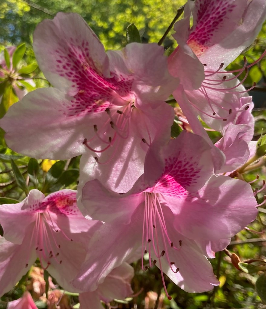 Azaleas are found tucked in by a stream in the woods then further along, bordering the trail. The sunlight splashes on the petals, causing me to pause and admire.