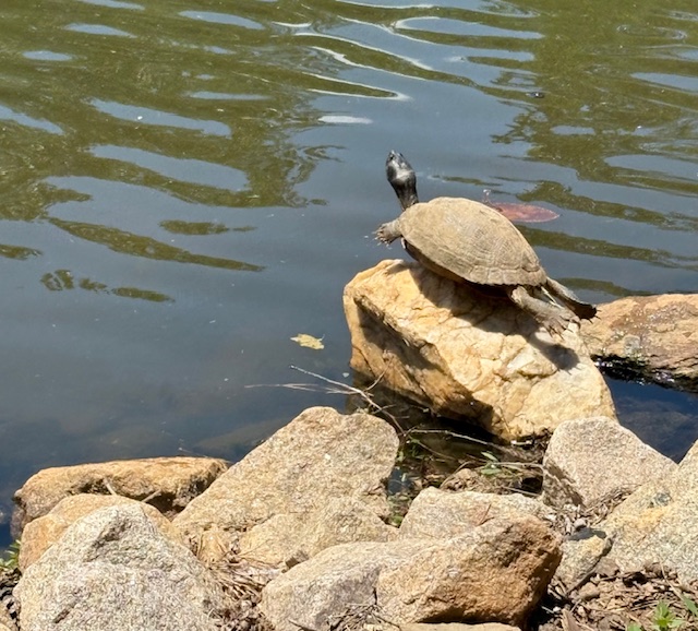 When the skies are blue, I like to wander by a lake where there are herons hunting and turtles basking in the sun. They are used to people passing by, so the sounds of footsteps and conversation don’t alarm them. Sometimes they seem to be posing for me.